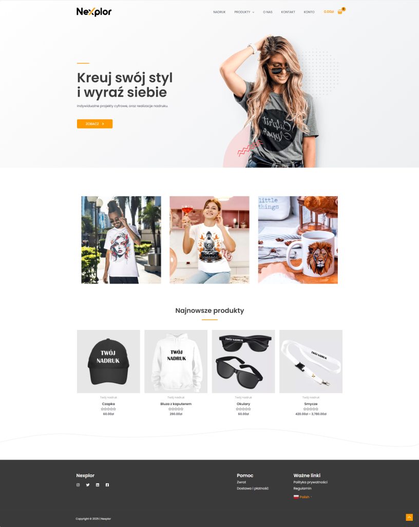 Nexplor to mój autorski sklep internetowy, w którym oferuję produkty mojej marki oraz starannie wyselekcjonowane produkty designerskie. Sklep koncentruje się na sprzedaży odzieży oraz gadżetów reklamowych, takich jak koszulki, bluzy, czapki, okulary czy kubki z nadrukiem. .