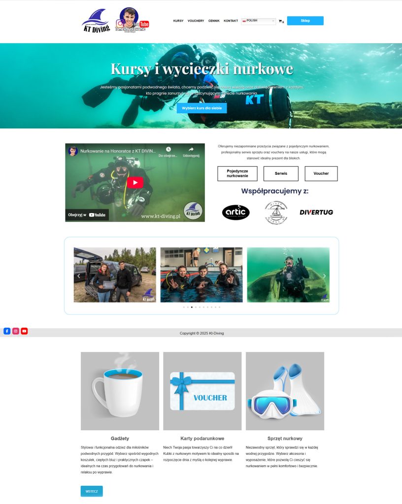 KT-Diving to moja pierwsza realizacja strony internetowej dla klienta – instruktora nurkowania. Strona została zaprojektowana tak, aby w przejrzysty i nowoczesny sposób prezentować ofertę kursów nurkowych oraz wypraw. Układ i estetyka witryny nawiązują do tematyki podwodnej, tworząc spójny i profesjonalny wizerunek mark.